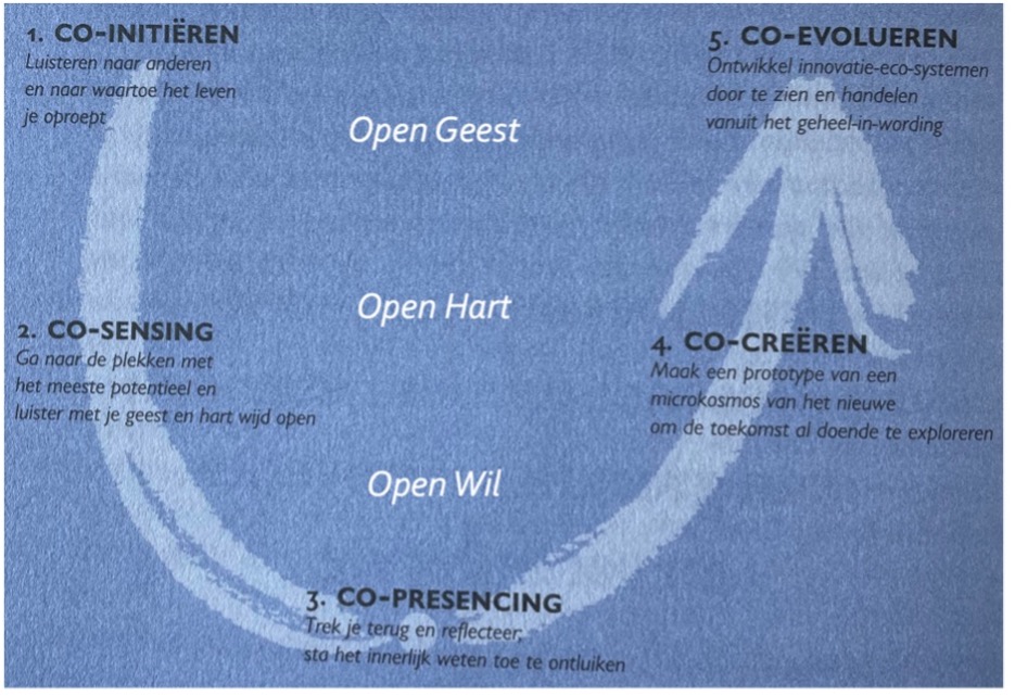 Een veranderingsgerichte professionaliseringsstrategie komt alleen tot stand wanneer alle betrokkenen de veranderstand kunnen komen. Hiervoor dienen zij vrij van zorgen en belemmeringen te zijn. Daarvoor dient eerst erkenning te zijn voor heersende angsten, zorgen en pijn. Door hier aandacht voor te hebben kunnen belemmeringen opgeheven worden een open geest, een open hart en een open wil in de weg staan. Daarmee kan het oude ‘Zelf’ losgelaten worden om plaats te maken voor het nieuwe ‘Zelf’. “Pas dan zijn we in staat een nieuwe wereld binnen te stappen”, aldus Scharmer (2018, p. 120) en daarmee een grondige verandering bewerkstelligen. Dit wordt bereikt via vijf stappen.